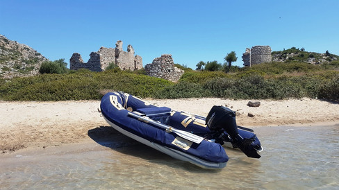 One day Baz and I took our dinghy and what felt like everything but the kitchen sink (folding chairs, table, picnic food), to have a picnic on one of the nearby beaches overlooking Kızılada Island. The water there is crystal clear and so shallow that it turns from deep azure to turquoise by the shore. There were plenty of other boats tied line ashore in that area, so there was lots for Baz and myself to watch before I went snorkelling.